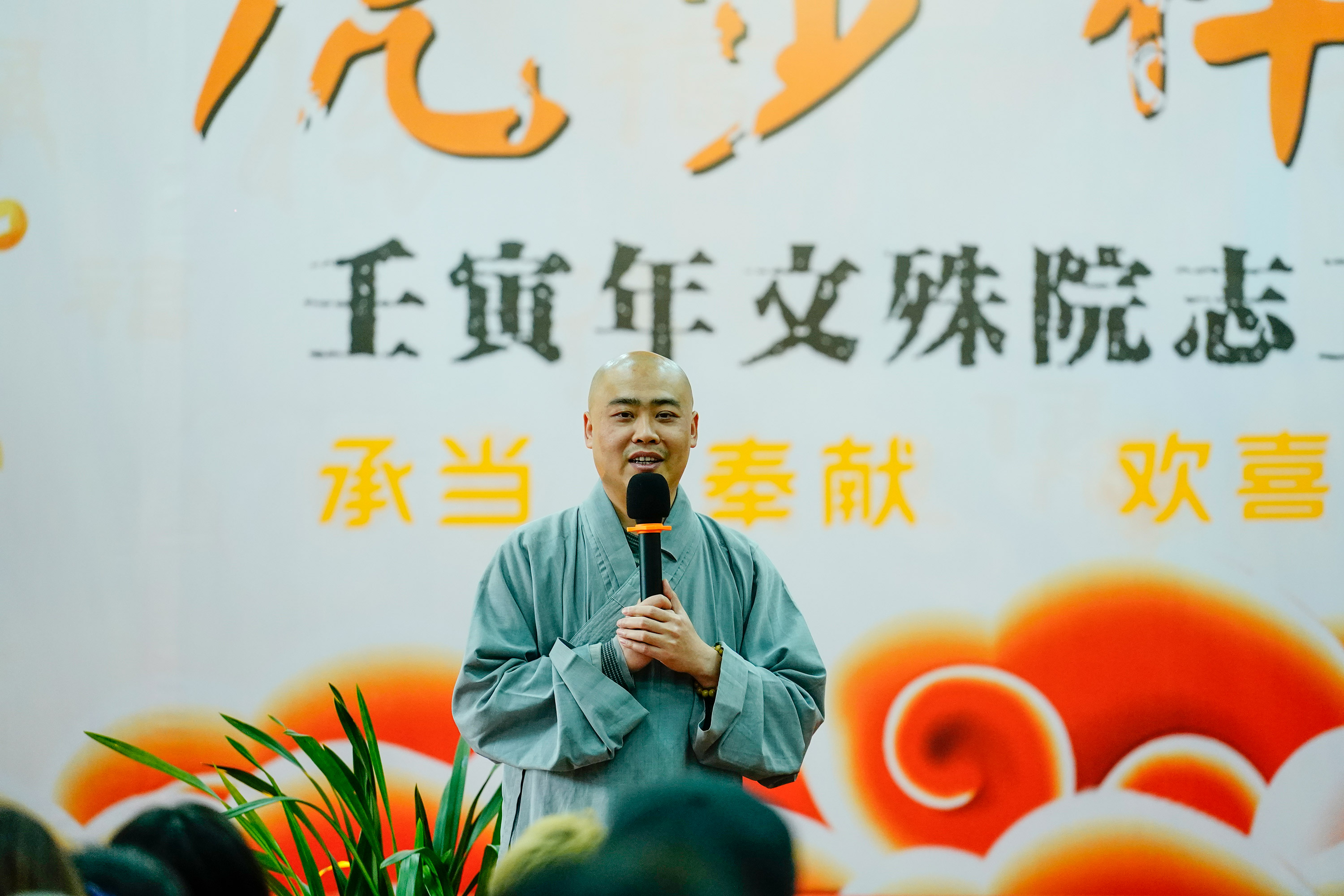 最后,文殊院监院崇禅法师受邀为大家开示,并送上新年寄语。法师对志工们带来的精彩演出给予了充分肯定,他还特别提到舞蹈《吉祥中国年》,认为这个节目很有年味,也很有氛围感,希望今后能有更多这种形式的表演。法师还说道:“非常感谢各位志工对文殊院的付出和支持,在新的一年里,希望大家能够继续秉持‘承当、奉献、欢喜、包容’的空林修养精神,一起学习,共同成长。”
